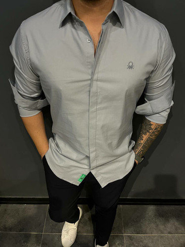 پیراهن مردانه آستین بلند خاکستری دکمه مخفی